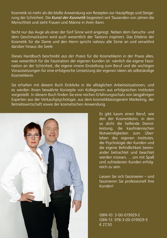 Dieses Handbuch beschreibt, aus der Praxis für die Kosmetikerin in der Praxis, alles, was wesentlich für die Faszination der eigenen Kunden ist: Nämlich die eigene Faszination an der Schönheit, die eigene innere Einstellung zum Beruf und die wichtigen Voraussetzungen für eine erfolgreiche Umsetzung der eigenen Idee als selbständige Kosmetikerin.